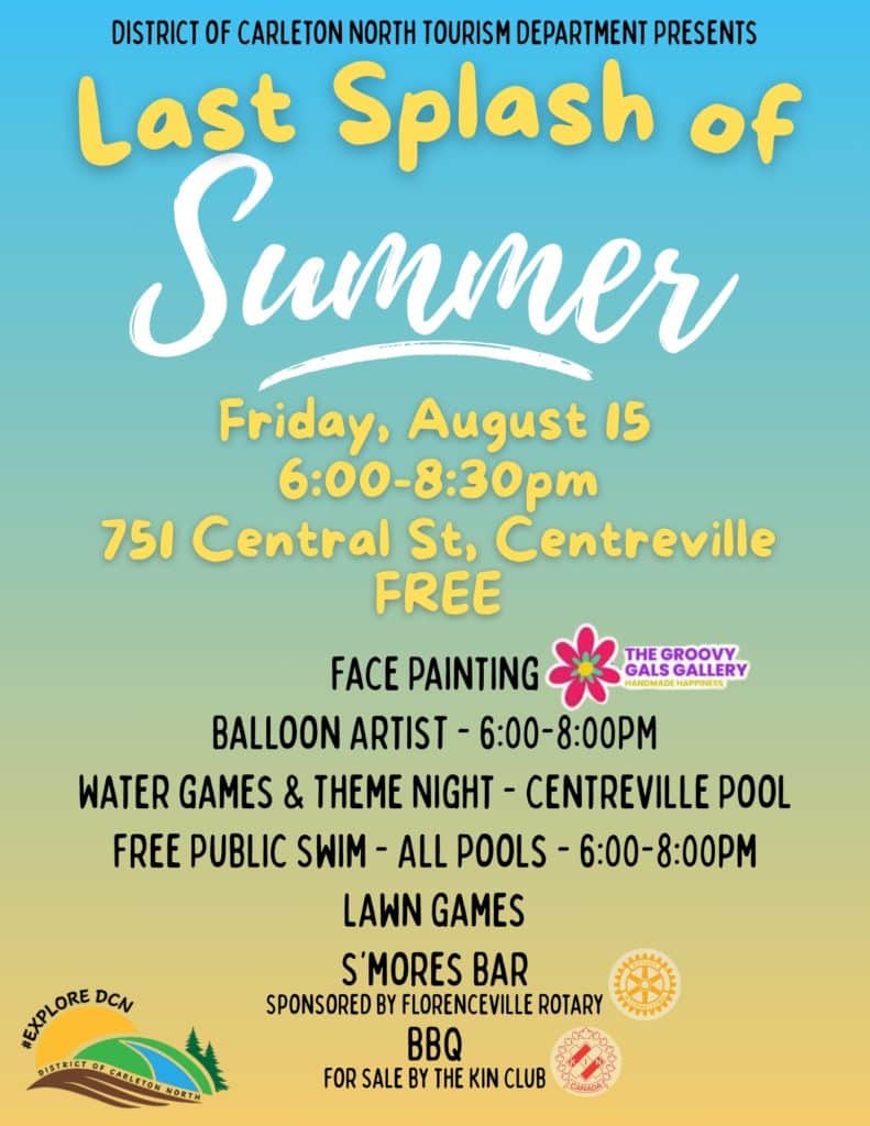 Join us for an evening of fun and games! Face painting, balloon artist, water games & theme night at the Centreville pool. FREE public swim at all pools, lawn games, S’mores Bar sponsored by the Florenceville Rotary and BBQ with food for purchase by the Kin Club.